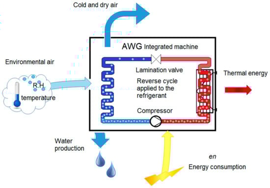 From Figure 1, it is clear that a traditional VCRC AWG requires energy to run the compressor and fans. It is worth noting that the very process of vapour condensation—regardless of the employed technique—requires external energy if significant quantities of water are needed (on the order of hundreds or thousands of litres per day) in a comparatively small space (this excludes fog nets, radiative panels, and some desiccant-based solutions). Even if the energy required for condensation could be minimised, a meaningful amount of energy is still needed to move large quantities of air through the AWG, bearing in mind that the vapour content in environmental air is typically on the order of a few tens of grams per kilogram of dry air [21]. Nevertheless, in a traditional VCRC AWG, all the energy spent in the process gives only one useful effect, namely, water extraction from the air; consequentially this technique rises some concerns about its sustainability [29].