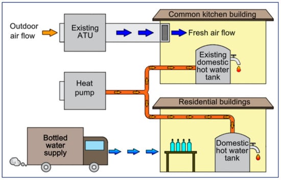 The integrated AWG represents an improvement over such technology and could be a game changer in atmospheric water capturing [30] because it allows users to recover the thermal energy fluxes generated during the process, thereby enhancing the global efficiency of the system. The working scheme of the machine is almost the same as that of a common VCRC AWGs; however, the key difference lays in the specific design of these systems, which has been optimised to make the dehumidified, cooled air and the heating flux removed from the treated air available for reuse. In particular, these machines are equipped with an additional plate condenser, suitable for coolant-to-water heat exchange, allowing, for example, domestic water heating. Moreover, the air outlet is designed to facilitate the delivery of the treated air—cooled and dehumidified—via ducts to an Air Treatment Unit (ATU) or directly to rooms as primary fresh air. In such a way, the integrated AWG can simultaneously provide three useful effects, namely, water, a flux of cold and dry air, and thermal energy, all with the same energy consumption (en, as shown in Figure 2).
