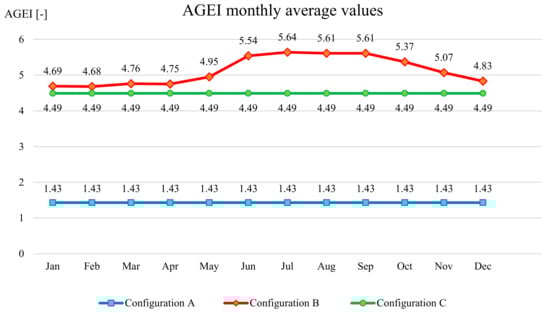 Recalling that, for integrated configurations, AGEI is equal to GEI, the AGEI value for the integrated machine is equal to 24. The efficiency proportion, applying AGEI, is perfectly maintained: the value of the index for the hybrid system is exactly half of the value reached by the integrated machine.