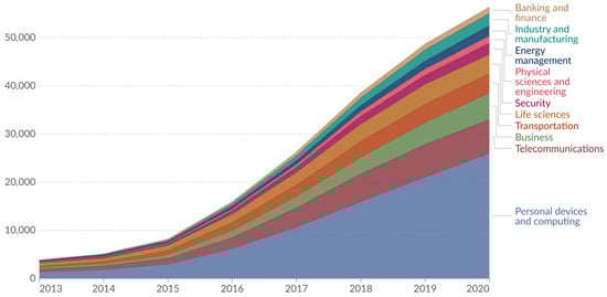 Annual patents related to artificial intelligence granted by industry worldwide (2013–2020). Adapted from [5].