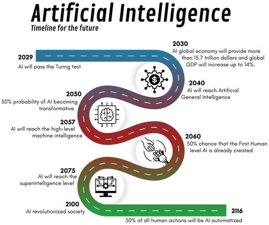 To the question “How do you see AI in the future?”, 170 researchers in the AI field answered that they expected that, by the year 2057, there will be a 9 in 10 chance that artificial intelligence will reach high-level machine intelligence, where most of the machines will be able to perform professional human actions, and in approximately 50 years (by 2075), it will be possible to reach the superintelligence level where, at this stage, machines will be able to exceed human intelligence in all domains [71]. They also projected a possibility of 33% that this fast development could go wrong [66]. Finally, experts predict that in 2100, AI will revolutionize society, leading to 50% of all human actions being automatized by 2116 [72,73]. Figure 7 illustrates the summarized timeline of AI evolution in the upcoming years.