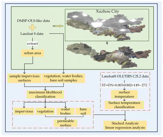 For this purpose, the luminance information of DMSP-OLS-like data [] is used to obtain the vector map of built-up areas using the spatio-temporal normalized thresholding method based on pseudo-invariant features. Classification samples of water bodies, vegetation, and bare soil were established in the complete image using the corresponding indices, impervious surface classification samples were established in the built-up area using the Enhanced Impervious Surface Index, and the extraction of impervious surfaces was accomplished using the maximum likelihood classification method. Surface temperature inversion was performed using Landsat8 OLI/TIRS C2L2 imagery and surface temperatures were categorized into high-temperature, sub-high-temperature, medium-temperature, sub-low-temperature, and low-temperature zones based on the mean covariance method. The following analyses were performed to investigate the effect of impervious surfaces on surface temperature: (1) The overlay analysis of the impervious surface extraction results from 2013 to 2022 and the results after surface temperature grading in Xuzhou City showed that more than 50% of the impervious surface area is a high-temperature zone or a sub-high-temperature zone. (2) Based on the density of impervious surfaces, Xuzhou City is divided into three parts: impervious surface aggregation area, permeable surface area, and other impervious surface area. The average temperatures of the above three areas were calculated separately, and it was found that the average temperature was the highest in the impervious surface aggregation area. (3) A certain number of samples were selected in and around the built-up area, and the impervious surface density and average temperature of the selected sample areas were calculated and analyzed by linear regression. The results show that surface temperature and impervious surface density are directly proportional. In conclusion, the increase in impervious surface is one of the reasons for the increase in surface temperature, so the monitoring of impervious surfaces is of great significance for the management of the urban environment.