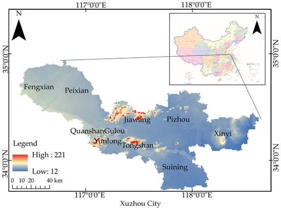 Xuzhou is the central city of the Huaihai Economic Zone, and its urbanization development is one of the important indicators of the degree of development of the Huaihai Economic Zone. Xuzhou is located in the southeastern part of the North China Plain, between longitude 116°22′–118°40′ E and latitude 33°43′–34°58′ N, covering an area of 11,765 km2. Xuzhou City is dominated by plains, which account for more than 90% of the area, with a few hills and mountains in the central and eastern parts of the city, as shown in Figure 2. (The map of China shown here is based on the standard map with review number GS (2016) 2923 downloaded from the website of the Standard Map Service of the Ministry of Natural Resources, with no modifications to the base map). There is a large amount of farmland distributed in the central part of Xuzhou City, and the confusion between impervious surfaces and bare soil is an urgent problem for impervious surface extraction.