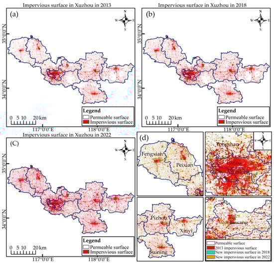 The distribution of impervious surfaces in Xuzhou City from 2013 to 2022. (a–c) show the impervious area extraction results for Xuzhou City in 2013, 2018 and 2022, respectively. (d) Changes in the distribution of impervious surface in some areas of Xuzhou City in 2013, 2018 and 2022.