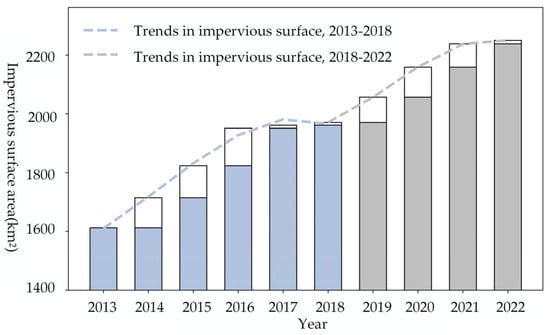 Figure 3 shows the distribution of impervious areas in Xuzhou City in 2013, 2018, and 2022 (2013–2022 Xuzhou City Impervious Surface Extraction Results in Supplementary Materials), as well as the change in the impervious surface distribution. From Figure 3d, it can be seen that the distribution of impervious areas in the center of Xuzhou City is relatively stable. In order to further analyze the change rule of impervious areas in Xuzhou city from 2013 to 2022, the impervious area of Xuzhou city in each year was calculated and linearly analyzed; as shown in Figure 4, the impervious area of Xuzhou city increased by 637.17 km2 from 2013 to 2022.