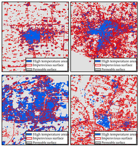 Figure 5 shows the distribution of impervious surfaces in selected areas in 2013 overlaid with the high-temperature areas from the surface temperature inversion results. From the figure, it can be seen that most of the impervious surface areas are high-temperature zones, especially in the areas where impervious surfaces are aggregated.