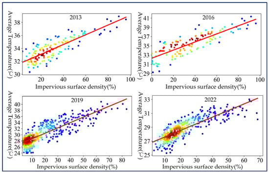 To deeply understand the influence of impervious surfaces on surface temperature, Xuzhou City was randomly divided into 300 blocks and the impervious surface density and average temperature of each block were calculated. The linear regression analysis showed that impervious surface density and surface temperature were positively, but poorly, correlated. It is observed that most of the areas corresponding to outliers are far away from the impervious surface aggregation area and are located in areas with a high percentage of bare soil, where the influence of bare soil on surface temperature is greater than that of impervious surface temperature. In total, 130 sample areas were re-selected in and around the area of impervious surface aggregation, and impervious surface density and average temperature were calculated for each sample. A regression analysis using the percentage of impervious surfaces in the selected blocks as the x-axis and the average temperature as the y-axis revealed that the density of impervious surfaces and the surface temperature are positively correlated. And, the coefficients of determination after removing the outliers were greater than 0.7, which indicated good correlation, and the results are shown in Figure 6. In summary, the increase in impervious surfaces is one of the reasons for the increase in surface temperature.
