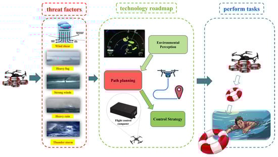 Figure 1, UAVs encounter numerous challenges in maritime rescue missions, primarily due to the intricate maritime environment, the urgent response demands, and the inherent risks throughout rescue operations. The unpredictability of the maritime environment, including severe weather conditions, strong currents, and rough waves, poses significant obstacles to rescue operations and often renders traditional methods ineffective [