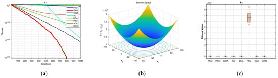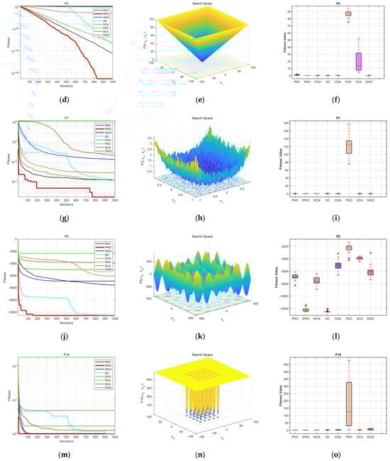 On the other hand, from a micro perspective, the time complexity of the Pied Kingfisher’s perching phase, improved by refracted opposite learning, is . The time complexity of the development phase, improved by the variable helix sine–cosine search algorithm, is . Additionally, the time complexity of the algorithm enhanced using the Cauchy mutation is . Therefore, from a micro perspective, the time complexity of the improved algorithm increases by , but the increase in each step does not cause a change in the order of magnitude; therefore, the total time complexity remains . In summary, from both macro and micro perspectives alike, there are no changes observed in terms of computational cost. Therefore, the improved algorithm does not increase computational cost, further proving the feasibility of IPKO.