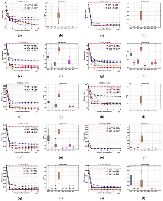 Compared to other algorithms, IPKO demonstrated a particularly robust performance. It was only marginally outperformed by the DSO algorithm in one test within a 10-dimensional environment, and by the SO and SCA algorithms, respectively, during separate tests within a 20-dimensional environment. These outcomes suggest that IPKO provides superior overall optimization performance. The convergence curves within the 20-dimensional environment reveal that IPKO possesses significant advantages in terms of both convergence speed and accuracy, which are particularly evident during tests f2–f7. This underscores its flexibility and efficient optimization strategy when dealing with intricate problems. Notably, IPKO not only demonstrates rapid convergence during the initial stages but also achieves stability near the optimal solution in the later stages, reflecting its strong global search capabilities as well as local exploitation prowess. Its ability to swiftly converge enables IPKO to efficiently discover high-quality solutions even amidst high-dimensional complex problems while maintaining stability throughout the entire optimization process.