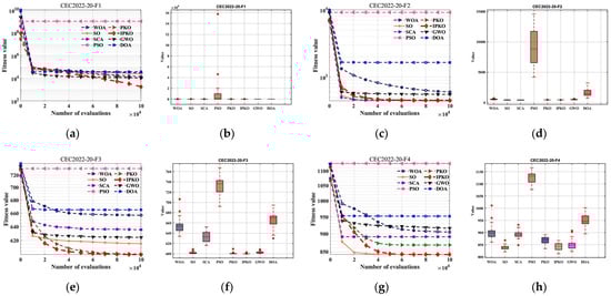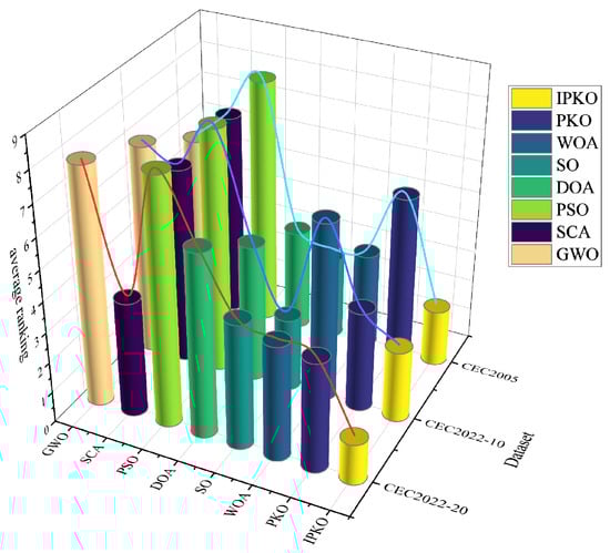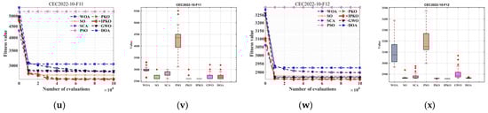 The previous experiments have demonstrated the superior performance of IPKO across CEC2005 test sets. However, with the continuous advancement of technology, optimization problems are becoming increasingly difficult and complex. To further validate the performance of IPKO, this study conducted detailed tests on its performance using the challenging CEC2022 test set. The CEC2022 test set comprises four types of functions: unimodal functions, basic functions, hybrid functions, and composite functions. These diverse function types offer a comprehensive evaluation of the algorithm’s performance in different problem scenarios. The first group of functions (f1) consists of unimodal functions with a single global optimum and relatively simple search space. Testing these unimodal functions primarily evaluates IPKO’s global search capability in uniform search spaces by assessing how efficiently it converges to the single global optimum. Since unimodal functions lack complex local optima, the algorithm’s efficiency in converging to the single global optimum is crucial. The second set of functions (f2–f5) comprises basic test functions, encompassing various optimization characteristics such as multimodal structures and separable and non-separable problems. These functions represent common types of fundamental optimization problems encountered in practical applications. The third set of functions (f6–f8) consists of hybrid functions composed of multiple sub-functions with different characteristics. Their aim is to assess the algorithm’s adaptability and optimization efficiency in complex optimization problems. Hybrid functions typically have complex structures and diverse characteristics, simulating the combined scenarios of various challenges encountered in real-world optimization problems. The fourth set of functions (f9–f12) includes composite functions that typically incorporate multiple complex characteristics to evaluate the overall performance of the algorithm in highly intricate optimization scenarios. Composite functions may feature multiple local optima, complex global structures, irregular search spaces, and other attributes, simulating highly complicated problems in real-world applications.