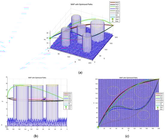 Table 8, the path cost of the IPKO algorithm is 119.97, indicating a reduction of 5.77% compared to the traditional PKO algorithm with a path cost of 127.32. Furthermore, when compared to the DOA algorithm with a path cost of 195.05, this reduction amounts to 38.49%. Consequently, it can be concluded that the IPKO algorithm effectively improves the efficiency of UAVs during maritime rescue missions.