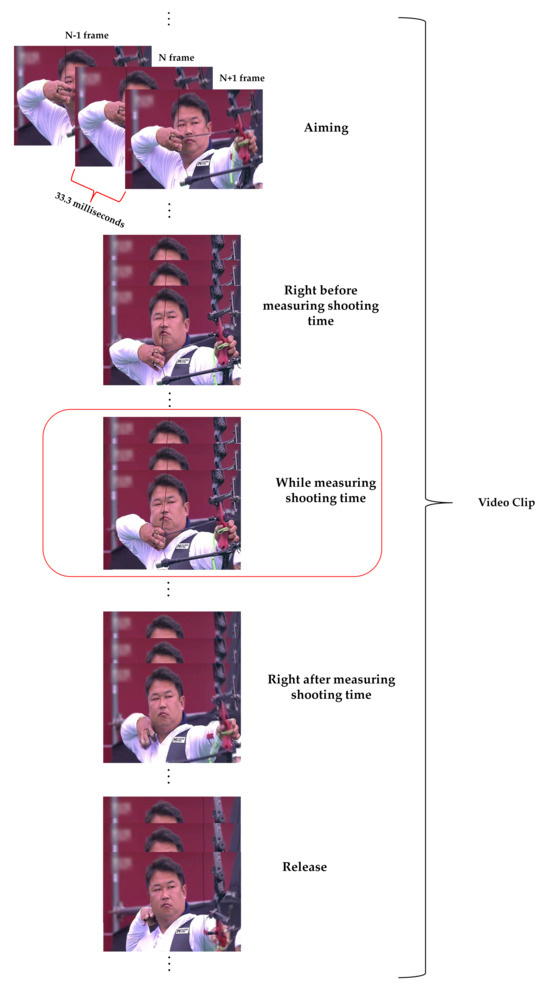 In this study, a method for automatically measuring shooting time in archery was developed and evaluated using a dataset constructed from actual archery broadcast footage. The data used in the research was collected from publicly available archery match broadcasts on YouTube, including events from the 2024 Paris Olympics and the Korean National Archery Team Special Match, allowing for a comprehensive analysis of world class competition environments and athlete movements. The URL of the data source used for testing in this study is specified in the Data Availability Statement. The dataset consists of high-resolution (1080P) videos shot from the front, clearly showing the athletes’ upper bodies and faces, and with the archers’ right arms sufficiently contained within the frame. In addition, video clips containing the entire sequence of drawing, anchoring, aiming, and release were cropped and used, and the shooting time was defined as the period from anchoring to release phase. Each clip contained the process of a single arrow shot. Figure 1 shows examples of the video clips and defined shooting times used in this study, and prior consent was obtained for the use of the athlete’s image in the paper. A total of 58 video clips were used in the experiment. Shooting time was calculated using Equation (1), by converting the number of frames (F) from the start of the anchoring phase to the release phase into actual time, with all video clips recorded at 30 frames per second (FPS).