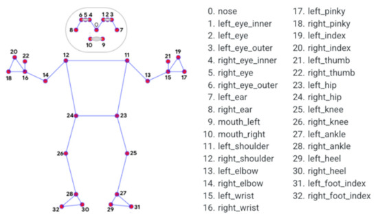 - Bazarevsky, V.; Grishchenko, I.; Raveendran, K.; Zhu, T.; Zhang, F.; Grundmann, M. On-Device Real-Time Body Pose Tracking. arXiv 2020, arXiv:2006.10204. [Google Scholar]