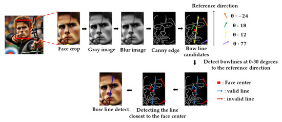 In the process of detecting the bowstring within the facial region, various lines may be detected, which could lead to inaccurate measurement of the shooting time if non-bow lines are mistakenly detected. For instance, lines such as the athlete’s glasses or jawline were occasionally detected in the video clips. To address this, the proposed method identifies the line that best matches the characteristics of the bowstring and uses only this line for measuring shooting time. The bowstring in the facial region typically appears near the center of the face and falls within a specific range of slopes. Considering this, the method selects the line closest to the center of the face among the candidates detected by the Probabilistic Hough transform and evaluates its slope. Specifically, as shown in Figure 4, the Euclidean distance between the face center and each line was calculated to find the closest line, and the slope () of this line was assessed to determine if it matched the typical bowstring slope. The reference direction was defined as vertical, extending upward from the center of the face, and only lines with a slope between 0 and 30∘ relative to this direction were identified as the bowstring.