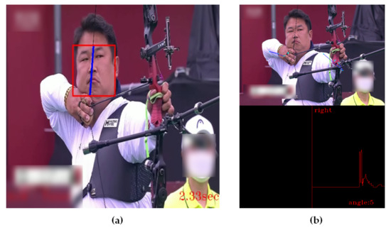 Algorithm 1 presents the step-by-step process of the proposed method. Figure 5 is an example screen showing the application of the proposed program to an actual video clip, where the red box represents the face bounding box and the blue line represents the detected bowstring. (a) shows the step of measuring the shooting time in real time from the anchoring start point, and (b) shows the step of calculating the right arm angle in real time to find the anchoring start point. The video showing the entire process can be found at [https://www.youtube.com/watch?v=tvMkULD66yo] (accessed on 15 December 2024), and the video is based on a video shot during the actual training process, not a prebuilt video clip.
