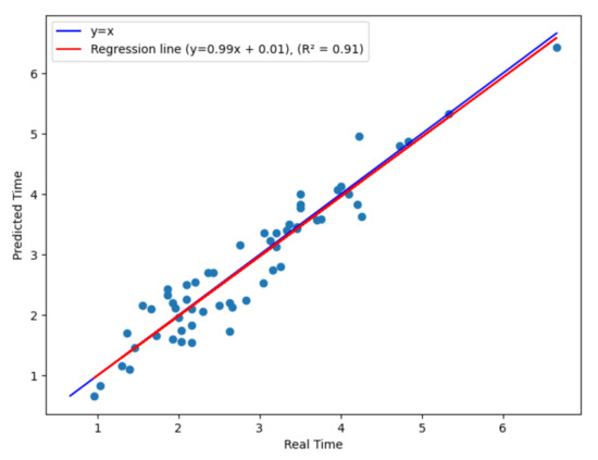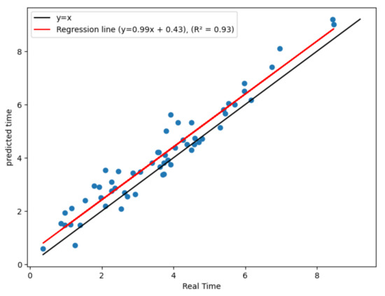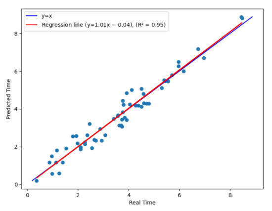 Scatter plot with regression line showing the relationship between measured shooting times using the proposed method and actual shooting times, along with the score indicating the model’s accuracy.