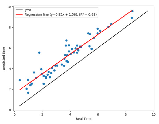 To evaluate the accuracy of the shooting time measured using the method proposed in this paper, the difference from the actual shooting time was calculated using the MAE as defined in Equation (2). This represents the absolute time difference between the two, and an average error of approximately 0.34 s was observed across 58 video clips. Figure 7 visualizes a scatter plot and regression line comparing the actual shooting time of the archers with the shooting time measured by the proposed method, showing that the relationship between the two closely aligns with the y = x line. Additionally, the value was 0.95, indicating a very high correlation.