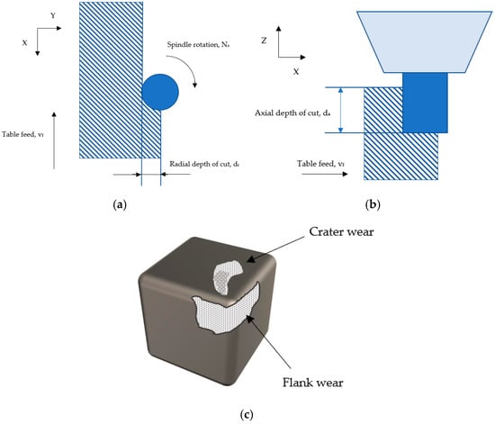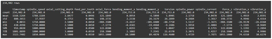 To begin the analysis, the NUAA dataset was loaded. Then, it was cleaned and reorganized by removing irrelevant columns and rearranging the remaining ones. With the data prepared, an initial exploration was conducted to understand the structure of the dataset. Figure 1 offers descriptive statistics that are reviewed to gain a better understanding of the data characteristics, Figure 2a,b remain as support images to help illustrate a generic milling operation diagram to clarify milling parameters [17,18,19], and Figure 2c illustrates the different types of tool wear, out of which flank wear is the focus of this article.