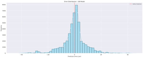 The second plot (Figure 6) visualizes the error distribution, showing the difference between the actual and predicted values. The distribution should ideally be centered around zero, indicating that the model’s errors are balanced and not consistently over- or underestimating tool wear. The histogram shows a relatively symmetric error distribution around zero, with a narrow spread. This suggests that most of the model’s predictions are close to the actual values, with a few larger errors appearing in the tails of the distribution.