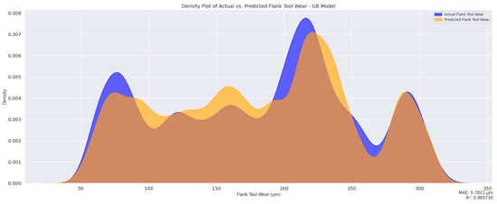 The third plot (Figure 7) compares the overall distribution of the actual and predicted tool wear values using density plots. The blue curve represents the actual tool wear, while the orange curve represents the predicted values. The degree of overlap between these curves shows how well the model captures the general pattern of the data. Here, the predicted distribution follows the actual distribution quite well, especially for moderate tool wear values, although the model seems to underperform in predicting extreme tool wear, which leads to a slight mismatch at the higher values.
