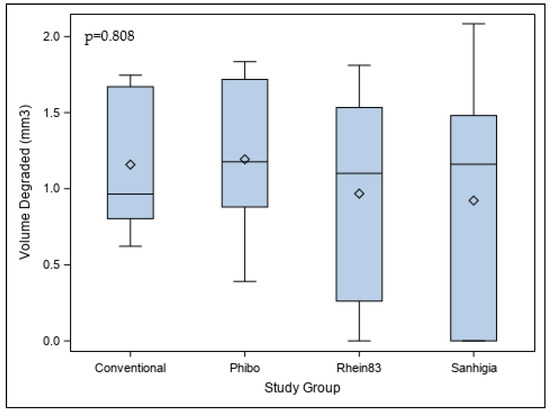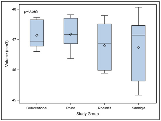 p = 0.569) in the postoperative volumetric differences of the internal threads at the conical internal hex implant–abutment connection between the conventional, Phibo, Rhein83, and Sanhigia study groups (