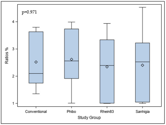 p = 0.971) in the volumetric ratio (%) between the pre- and postoperative volumes of the internal threads at the conical internal hex implant–abutment connection between the conventional, Phibo, Rhein83, and Sanhigia study groups (