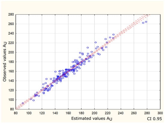 The first stage of modelling was the estimation of linear regression parameters for estimating the usable area of buildings based on a dataset from architectural offices. The initial dataset consisted of 191 one- and two-storey residential buildings with multi-pitched roofs. Figure 1 shows the relationship between the predicted and observed values for the dependent variable: the usable area (AU) of the building, for the last form of the linear model, considered to be optimal, after rejecting 8 outliers and resigning from the most insignificant variable—the boiler room (B). The goodness-of-fit of this model to the data is at the level of 95%.