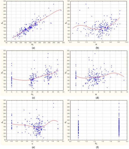 A series of scatterplots were then created to illustrate the dependence of AU on each independent variable. The plots include lines estimated using the least squares method, which show the relationship between individual independent variables and AU. These figures allow visualization of the shape of the impact of individual variables on the usable area of the building and influence the decision to select the mathematical function fi, which describes the dependence of AU on individual independent variables. The aim of this process, described in detail in [], was to create a nonlinear model in an additive form (2) that would reflect the relationships between variables better than linear regression.