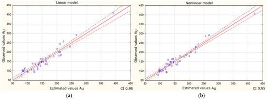 Figure 4a,b are very similar and the points in both plots are relatively close to the regression line. The red dashed lines indicate the 95% confidence interval. For the nonlinear model, there is a slightly greater overlap of the predicted values of the usable area to the observed values of this variable; the points are more concentrated around the regression line and the determined confidence area. This is consistent with the evaluation of both models based on the coefficient of determination.