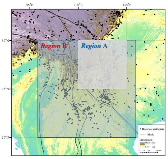The North–South Seismic Belt is one of the most frequently seismically active regions in mainland China, with a complex geologic structure in which the collision of the Indian Ocean plate with the Eurasian plate led to the uplift of the Tibetan Plateau and the formation of a series of tectonic fracture zones. Among them, the southern section of the North–South Seismic Belt is the convergence boundary of the relative tectonic movements of the Tibetan Plateau block and the South China block, so the seismic activity and the probability of strong earthquakes in this region are high. Researchers have differed in understanding the extent of each segment of the North–South Seismic Belt [26,27,28]. This study tentatively takes the area within (20° N~30° N, 96° E~106° E) as the southern segment of the North–South Seismic Belt (Figure 1), which includes the Xiaojiang fault zone, the Zhongdian–Honghe fault system, the Chenghai fault zone, the Chuxiong–Jianshui fault zone, the Yuanmou–Luzhijiang fault zone and the Southwestern Yunnan seismic tectonic zone, etc. These fault zones have different tectonic movement characteristics, such as sinistral slip, dextral slip, etc. They are closely related to many large earthquakes, such as the 2008 Wenchuan 8.0 magnitude earthquake.