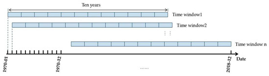 In constructing an earthquake prediction model, the accuracy of certain parameters, like the b-value obtained using the least squares method, depends on the number of seismic events within the time window. If the number is insufficient, the calculated b-value will lose reliability due to significant errors. Therefore, the time window was set to ten years to ensure that a sufficient number of seismic events were available for analysis within the time window. In addition, two different training set-to-test set ratios were set up for comparison experiments, these being 7:3 and 8:2, respectively. Finally, the sliding window was set to one month to accommodate short-term seismic prediction needs (Figure 2).