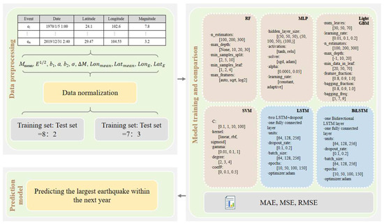 Figure 3 illustrates the methodology adopted in this study. To comprehensively evaluate and select the optimal magnitude prediction model, we conduct a systematic experimental design in subregion A of the southern segment of the North–South Seismic Belt (25° N~30° N, 100° E~105° E). The earthquake catalog data, which formed the basis of this study, were used to calculate seismicity parameters. These parameters are organized into a time series and used as core features for model training and optimization. The data were divided into training and test sets to evaluate model performance and prevent overfitting effectively. Specifically, two ratios were used: 80% training and 20% test and 70% training and 30% test to ensure adequate validation of the model’s ability to generalize to unknown data. During model training, grid search was used for hyperparameter tuning to find the optimal combinations in the predefined parameter space, maximizing prediction accuracy and stability. As a result, the selected model exhibits high reliability and robustness. Finally, the optimal prediction model was chosen based on evaluation metrics to predict the maximum magnitude within the following year.