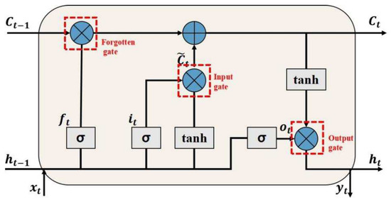 LSTM is a particular recurrent neural network (RNN) proposed by Hochreiter and Schmidhuber in 1997. It is designed to address the gradient vanishing and exploding problems standard RNNs encounter when handling long data sequences. LSTM effectively captures and retains long-term dependencies by introducing memory cells and gating mechanisms. It is widely used in time series prediction, natural language processing, and other fields [37]. The core of an LSTM unit consists of its internal memory cell and three gates: the input gate it, the forget gate ft and the output gate ot. Each gate controls the flow of information in and out of the memory cell, determining which information should be remembered and which should be forgotten (Figure 4).