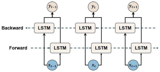 BiLSTM is an extension of LSTM that simultaneously considers forward and backward information in a sequence. Specifically, BiLSTM consists of two independent LSTM layers: the forward LSTM layer performs forward propagation in the order of the input sequence, while the backward LSTM layer performs backward propagation in the reverse order of the input sequence (Figure 5). In this way, the output at each time step of BiLSTM contains information from the current and previous steps as well as the current and subsequent steps. Therefore, BiLSTM is highly effective for tasks requiring considering both past and future information within a sequence.