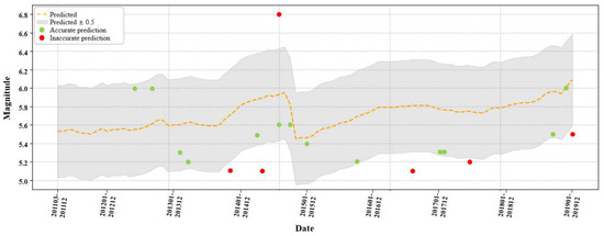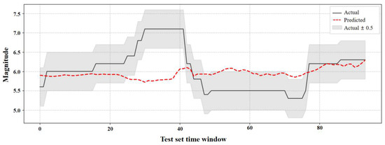 After applying the model to Region B, the results are as expected: 63 seismic events were accurately predicted in 94 time windows, achieving an accuracy rate of 67%; 14 false alarms with a 15% false alarm rate; and 17 missed alarms with an 18% missed alarm rate (Figure 9). Among these, the results of the LSTM model for predicting medium–strong earthquakes of magnitude five or higher within the time window are shown in Table 7. Specifically, 49 forecasts fall within the interval of magnitude (5 < ML ≤ 6), with 35 accurate predictions, yielding an accuracy rate of 71%, and 14 false alarms, with a false alarm rate of 29%. Additionally, there were 45 predictions within the interval of magnitude (ML > 6), of which 28 were accurate, with an accuracy rate of 62%, 0 were false predictions, and 17 were missed, with a missed alarm rate of 38%. It can also be observed that, with the increase in the number of strong earthquake cases (Table 1), there is a significant improvement in predicting strong earthquakes. Overall, the model is shown to have good generalizability for predicting medium–strong earthquakes through the extended test in Region B. Despite different challenges and constraints, the model still demonstrates better prediction results in the new region.