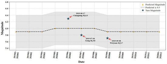 In this study, the last time window ends in December 2018. We attempted to supplement the seismic data from January to December 2019 to predict the maximum magnitude of an earthquake that may occur before December 2020. The results are shown in Figure 8: The region will likely experience earthquakes with a maximum magnitude of about ML6.0 in the future. As time progresses, moderate to strong earthquakes indeed occur, including the ML6.3 earthquake in Changning, Sichuan, on 17 June 2019, the ML5.8 earthquake in Gongxian, Sichuan, on 4 July 2019, and the ML5.7 earthquake in Weiyuan, Sichuan, on 8 September 2019.