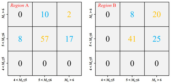 Using the above method, we focused on predicting accuracy within the moderate to strong earthquake range. As shown in Figure 10, for Region A, within the test set time window, there were 67 earthquake events with magnitudes of 5 < ML ≤ 6, of which the LSTM model successfully predicted 57, resulting in an accuracy of approximately 85%. For earthquakes with magnitudes greater than ML > 6, there were 19 events, and the LSTM model successfully predicted 2 of them, with an accuracy of about 11%. For Region B, there were 49 earthquake events within the 5 < ML ≤ 6 range and the LSTM model successfully predicted 42 of them, with an accuracy of approximately 86%. There were 45 earthquake events with ML > 6, and the LSTM model successfully predicted 20 of them, resulting in an accuracy of about 44%. These results indicate that the model performs well in predicting earthquakes within the 5 < ML ≤ 6 range.