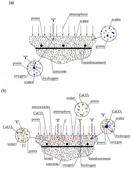 Hence, processes of radiation-triggered heating, carbonization, and radiolysis of chemically bound and unbound pore water are of predominant importance in the mechanistic modeling of processes reinforcing steel corrosion in concrete. Moreover, a general decrease in crack resistance (caused by carbonization) facilitates greater penetration of CO2 due to cracking and, consequently, causes an increase in the carbonization depth [134]. Similarly, the process of carbonization is accelerated by high temperatures [134].