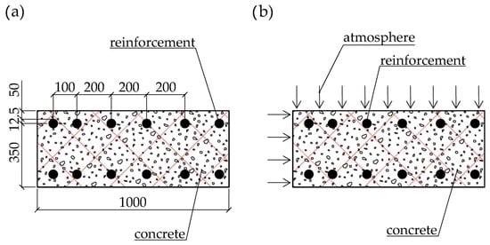 Scheme of a wall segment modeled in the COMSOL software package, where (a) is the geometry of a modeled segment of a reinforced concrete wall (dimensions are shown in mm), and (b) shows boundaries of a concrete wall segment interacting with the surrounding atmosphere.