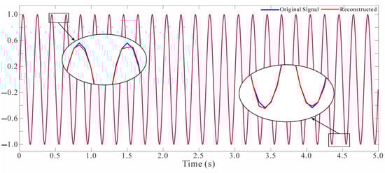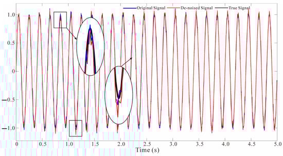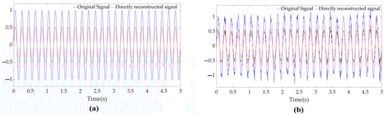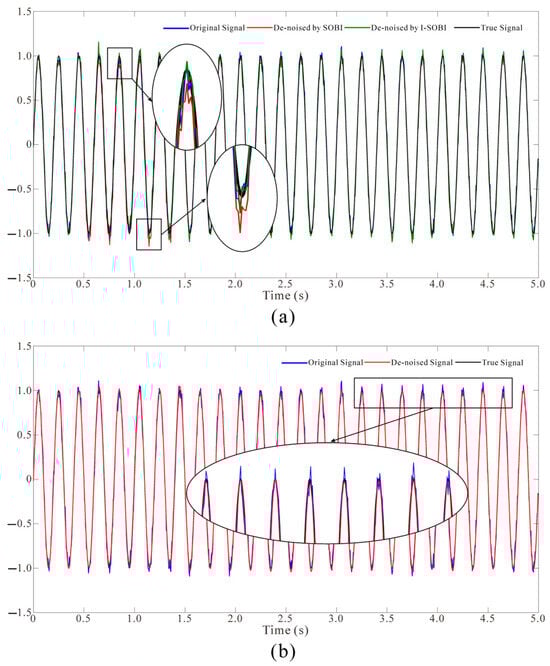 - The proposed I-SOBI method is adept at preserving the valuable information within separated signals throughout the reconstruction process. Figure 10 and Figure 11a illustrate that traditional SOBI’s de-noising performance is suboptimal, often introducing additional noise, as indicated by the red line in the figures. This limitation arises from the traditional SOBI’s difficulty in precisely separating nonlinear signals, which results in each separated signal retaining useful information. The straightforward discarding of noise-representing signals and subsequent reconstruction [20] inevitably results in inadequate noise-reduction. In contrast, the I-SOBI method yields a signal that is closer to the true value. By taking into account the dominant frequencies in the separated signals and optimizing the transformation matrix , the I-SOBI method maximizes the retention of non-noise information, thus effectively preventing the introduction of extraneous noise. Nonetheless, the reconstructed signals still exhibit some random fluctuations indicative of residual high-frequency noise effects.