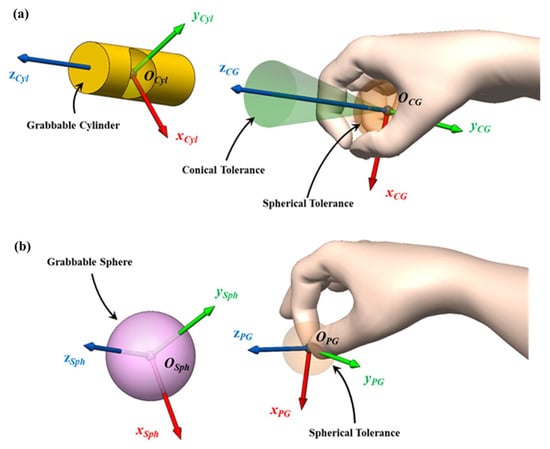 Equation (1) describes a spherical zone of tolerance and Equation (2) a cylindrical one. These constraints are different from the original GAF/OAF implementation since they can explicitly express the angular tolerance of the alignment between the cylindrical axes, which is a condition easier to be checked and integrated for real-time monitoring. For the pinch grip, the fundamental elements of the two reference frames on the hand and on the virtual object are the origins e , respectively. Figure 1b shows the spherical tolerance, described by Equation (3), within which the constraint can be activated.