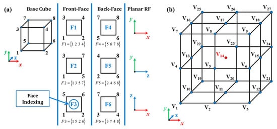 (a) Face indexing for each face of the base cube created in the application with the left-handed reference frame, and (b) the vertex naming order in the generic mesh, which allows the adaptation of the Catmull–Clark algorithm and the removal of not-showed vertices (red).