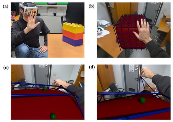 The headset chosen for the implementation of the case study is the Varjo XR-4. It is a high-end mixed-reality helmet equipped with two mini-LED displays with a resolution of 3840 × 3744 at 51 PPD and a 90 Hz refresh rate. It is equipped with 20 MP pass-through cameras. The spatial awareness is achieved by a 300 KPix LiDAR with 7 m range. It does not have its own hand-tracking system, but it can be achieved by using 2nd generation Ultraleap’s Leap Motion Controller to be integrated with a proprietary mounting kit. This device has two infrared cameras and multiple infrared LEDs. For each hand, the controller is able to track 24 joints, returning the spatial coordinates of 4 finger joints for each of the 5 fingers (knuckle, proximal, intermediate, and distal) and 5 additional joints for the palm and wrist. The 2nd generation device has improved performance with respect to its 1st generation that was extensively used and assessed by the scientific community [,]. The manufacturer provides development libraries that allow direct access to the tracking information that becomes necessary to be able to apply the algorithm and procedures described in the previous sections.