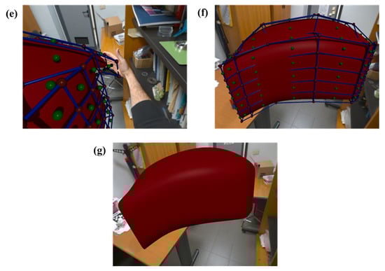 Figure 7 shows an initial photo (a) and 6 frames captured by the Varjo XR-4 cameras during the AR experience of the case study. In the first step (b), the user explores the virtual scene and locates the starting geometry collimating it to the real environment. In the first frame (b), it is possible to see how depth occlusion with the user’s hands is active, which returns great realism. The control cage is depicted in blue, the control vertices in red, the edges of the cage in blue, and the subdivided surface in red. Points and lines are depicted as three-dimensional geometries in order to give a spatial awareness. Green spheres indicate the centres of the control cage faces to facilitate the selection and grabbing. In the second step, the user selects the various vertices of the control cage on which he imposes various movements to sculpt the final geometry. The frame (c) shows an instant when the user selects a vertex. There is also the persistence of depth occlusion which facilitates the selection of the correct entity. The third frame (d) captures the user performing an interactive movement of the vertex and it is clearly visible how the geometry described by subdivision surfaces follows the movement. The fourth frame (e) shows an example of extruding a face of the control cage with the tracking of the open palm. In the next frames, (f) and (g), the final geometry is visible, with and without the control cage, respectively.