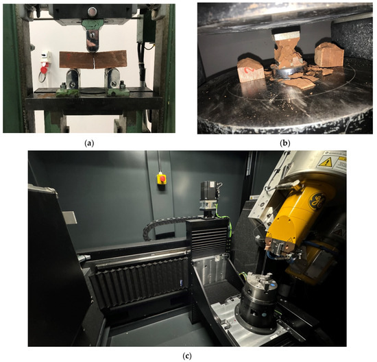 Research process: (a) flexural strength test; (b) compressive strength test; (c) computer tomography.
