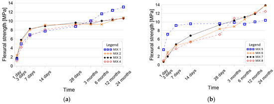 Flexural Strength of Cement Mortars (a) MIX 1–4 based on CEM I; (b) MIX 5–8 based on CEM II.