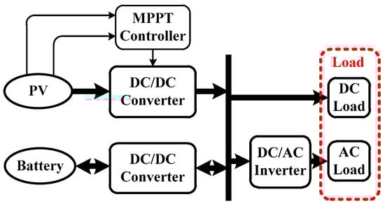 Photovoltaic (PV) systems are well known for their potential in green energy with the advantages of pollution-free power generation and low-cost operation and maintenance [1,2]. The main problem with PV systems is the uncertainty of the generated power, which depends on the weather [3,4]. To avoid energy waste and fulfil output requirements, energy storage-integrated PV power systems are used, normally with two individual DC-DC power converters [5,6,7]. One of the converters delivers the PV power to the load and/or battery with the implementation of maximum power point tracking (MPPT) algorithms. The other converter functions as a load power regulator. All the power generated by PV modules and/or battery is processed through these DC-DC converters, leading to limited efficiency of the whole PV system, low power density, and high costs [8,9].