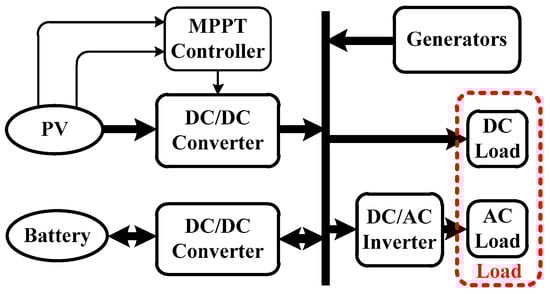 Figure 2 depicts the configuration of a hybrid PV power conversion system, consisting of PV panels, a BESS, two DC-DC converters, a DC-AC inverter and auxiliary generators. Under a high solar radiation level situation, the total load power is supplied by the PV panels and the surplus generated PV power is stored in the BESS. When there is a situation of insufficient sunlight and the energy storage can no longer supply the load power requirements, the generators provide the energy to the load and charge the battery.