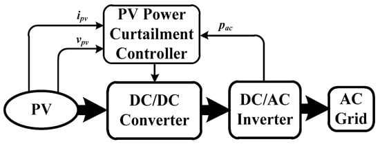 Figure 4 illustrates an alternative grid-connected PV system with a power curtailment control algorithm. The advantages of this method are a more straightforward implementation and a lower initial investment. When the PV power curtailment method is implemented, the power generated by the PV panels is lower than the maximum PV power, meaning that the operating point is at a suboptimal power level [36]. Therefore, the current–voltage (I-V) curve and the actual MPP need to be estimated to determine the available power. There are several existing and proposed methods for estimating the maximum available power point while operating suboptimally, which can be categorized into two types: measurement-based and curve-fitting-based methods [37,38].